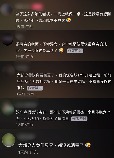 這幾位地攤老闆透露真實的營業情況,引發網民熱議:「這個就是做餐飲最真實的現狀。老闆是跟你說真話了。」「大部份人負債纍纍,都沒錢消費了。」