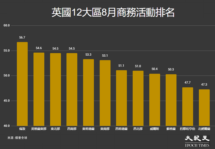 NatWest首席經濟師Sebastian Burnside表示:「英國大部份地區的企業在8月份表現較佳。倫敦持續領先,但東英格蘭、西南部及東北部同樣值得一提,錄得穩健的增長幅度。令人鼓舞的是,追蹤指標中的前瞻性數據總體有所改善。隨着大多數地區新業務增加,大部份地區的企業預期亦更為樂觀。」