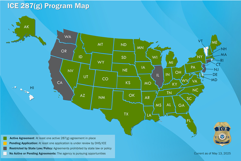 287(g)計劃允許ICE與州和地方執法機構簽署協議,授權後者執行部份聯邦移民執法職能,包括允許地方警察或監獄官員在特定情況下辨識、拘留或處理涉嫌違反移民法的個人。