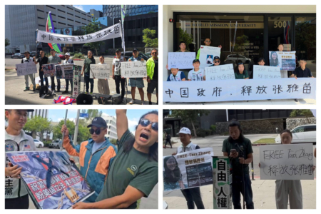 9月19日,海外中國民主黨國際聯盟黨員,在美國洛杉磯中共領事館門口為回國被捕的留學生張雅笛發聲,呼籲中共政府當局立即釋放張雅笛。