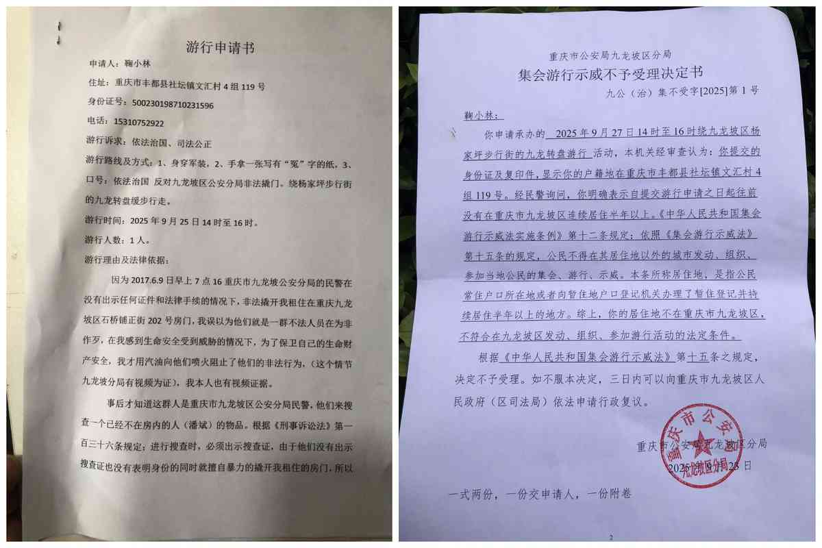 9月23日,重慶市九龍區公安分局回覆稱,經調查,鞠小林的戶籍地在重慶市豐都縣社壇鎮文匯村4組119號,自提交申請遊行之日起往前沒有在重慶市九龍坡區連續居住半年以上。依照《集會遊行示威法》第十五條的規定,公民不得在其居住地以外的城市發動、組織、參加當地公民的集會、遊行、示威,而不予受理。