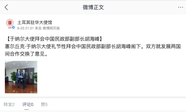 9月23日,土耳其駐華大使館在大陸微博、海外社交平台X和Facebook的官方帳號都發布了一條消息稱,塞爾丘克‧于納爾(SelçukÜnal)大使禮節性地拜會了中共民政部副部長胡海峰,「雙方就發展兩國間合作交換了意見」。