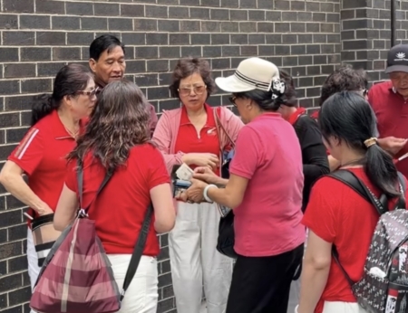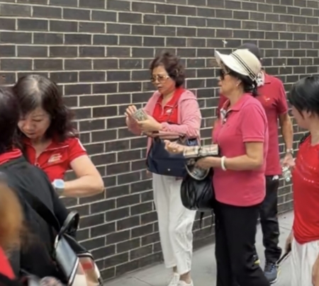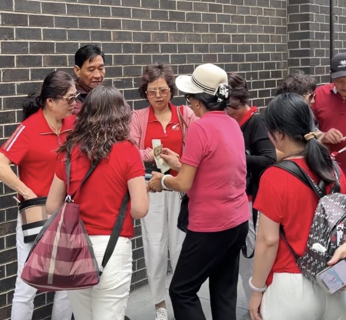 只見這些福建人統一穿著紅衣服,有的人拿著中共五星旗,好幾個人手上拿著錢。有一名女子的手上拿著一疊鈔票,在分發給其他人;另一名仕從包裏拿出更多的鈔票,另一個人伸著手準備接過來;拿到錢的人,趕緊把錢放起來。還有人用福州話說拿到了多少錢,待會去喝茶。