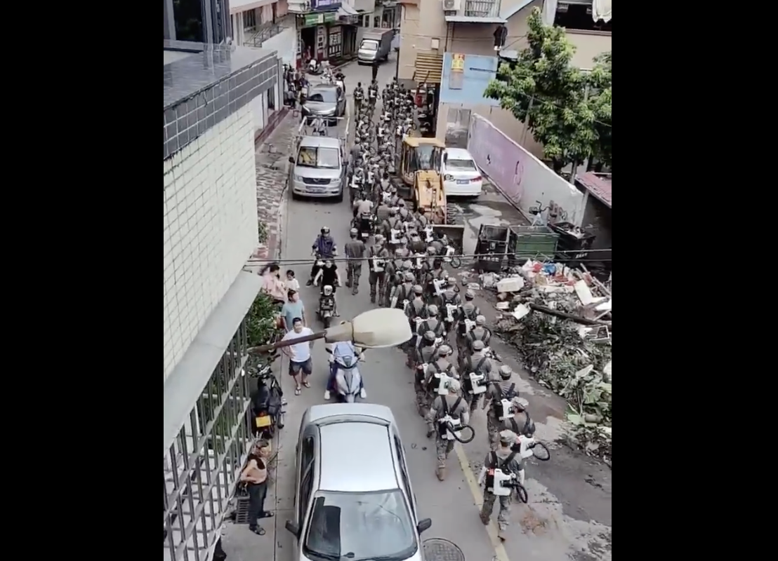 X帳號「海外爆料」說:「廣東江門再現生化危機反應部隊,清不清零不清楚,反正有點嚇人。看生化危機反應部隊裝備,似乎早有預謀,隨時準備再來一次封城禍國殃民。」#