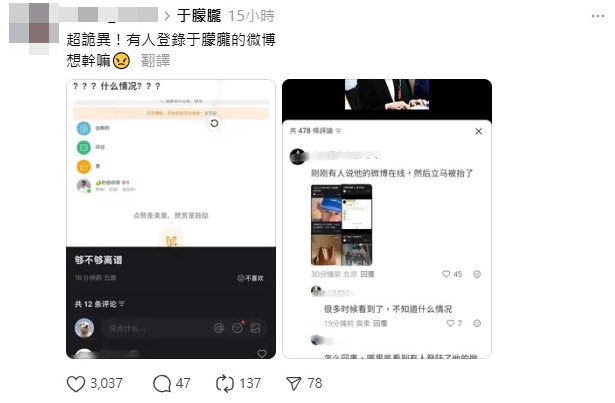 網民留言,「???甚麼情況???」「超詭異!有人登錄于朦朧的微博想幹嘛」「夠不夠離譜」。