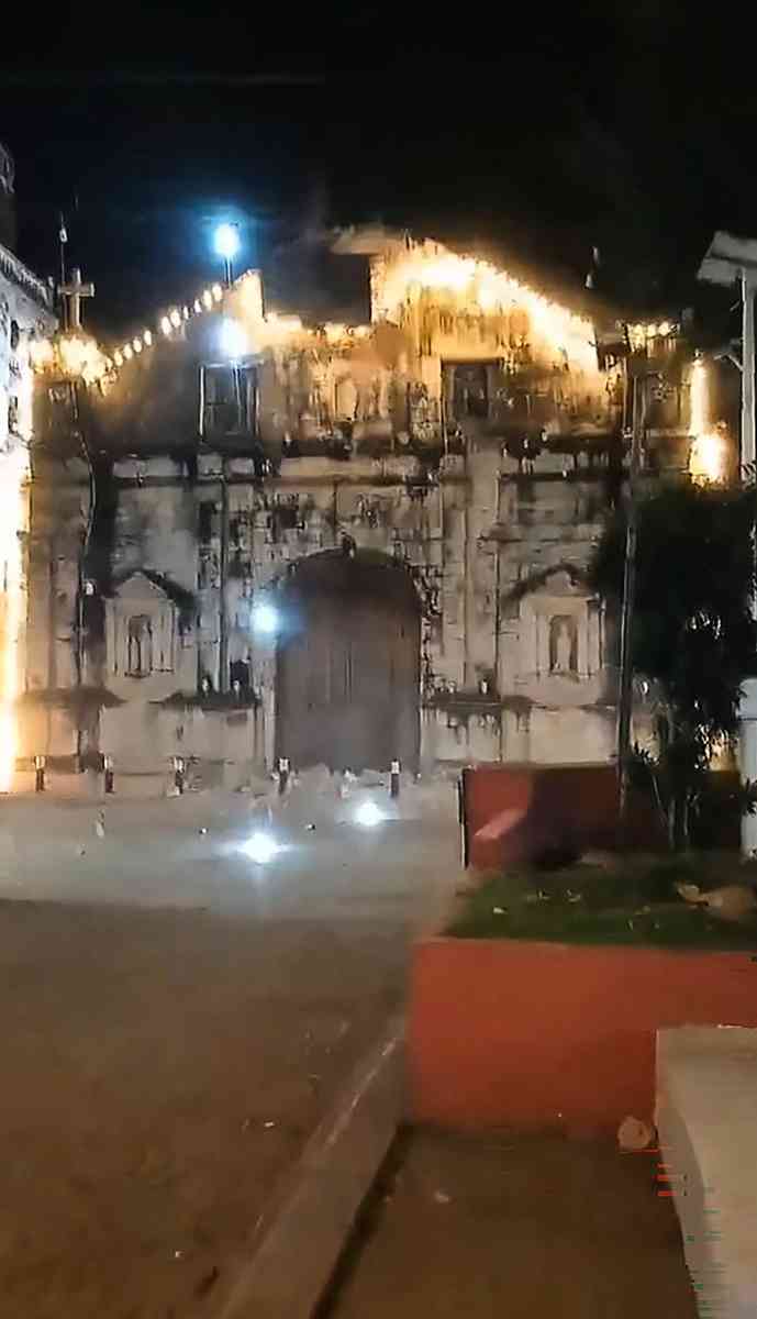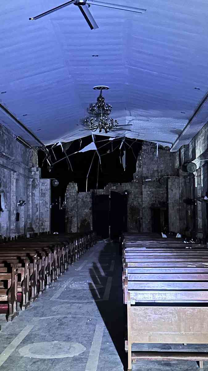 2025年9月30日,菲律賓中部發生6.9級強震,班塔延島(Bantayan Island)一座教堂屋頂上的十字架被震塌墜落。(Courtesy of Facebook user Martham Pacilan ,Facebook,UGC/AFP via Getty Images)