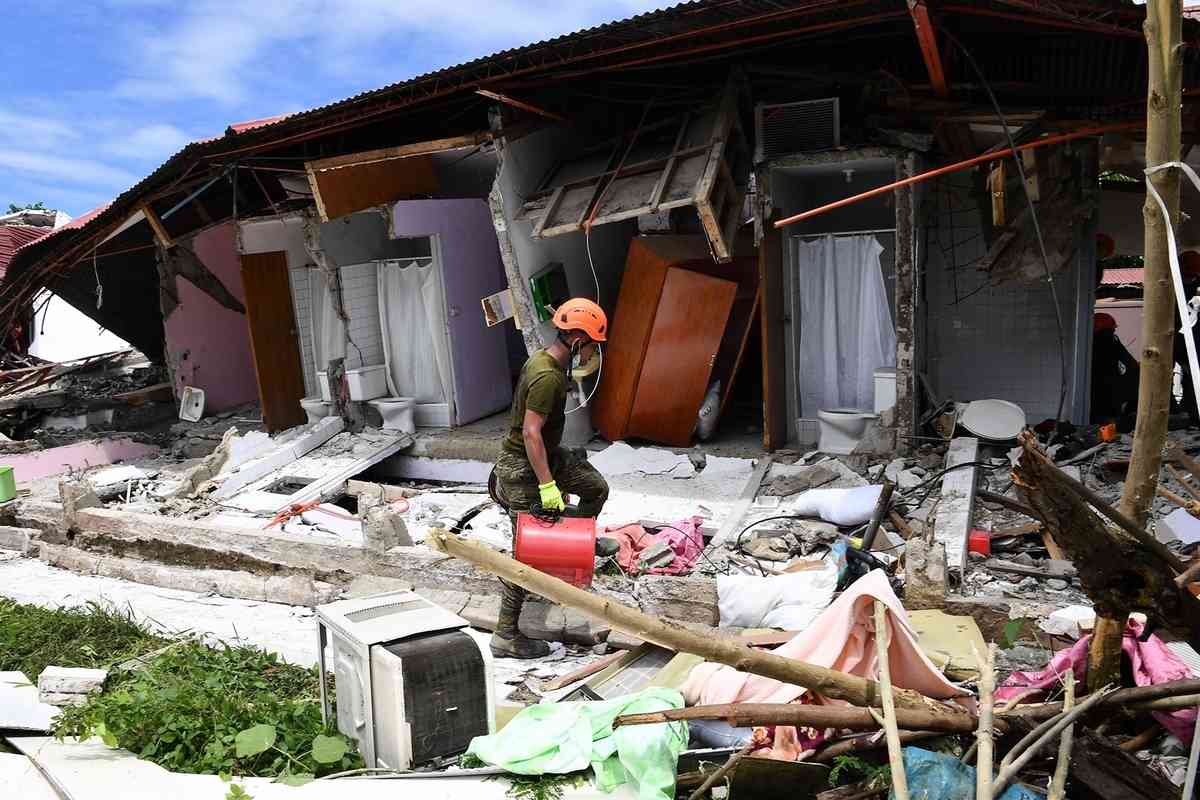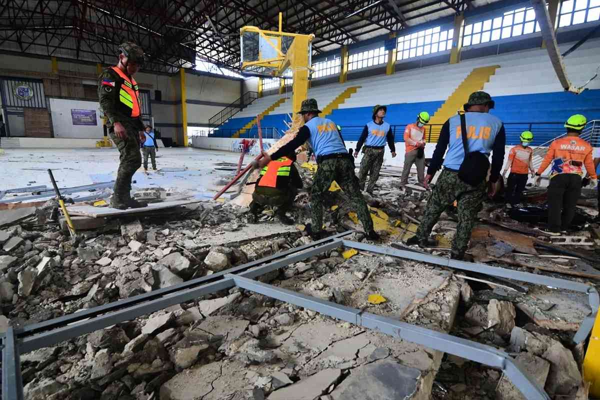 菲律賓中部於2025年9月30日晚發生的6.9級強震,導致宿務省聖雷米希奧鎮(San Remigio town)一座體育館坍塌,當時場館內正舉辦籃球比賽,釀成重大災情。圖為翌日,警察和救援人員檢查體育館的受損情況。(Alan Tangcawan/AFP via Getty Images)