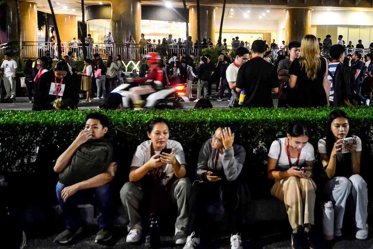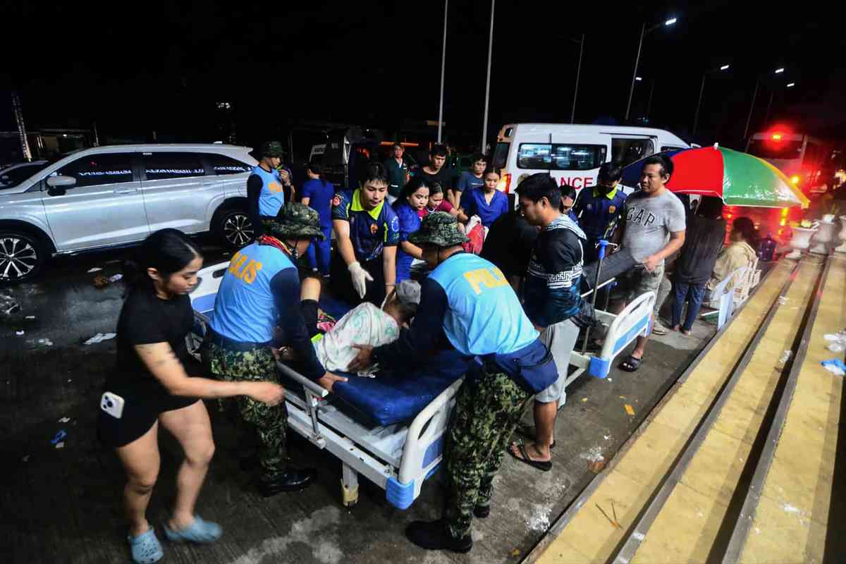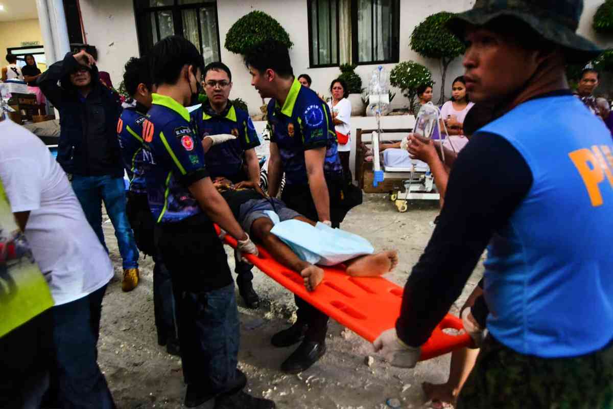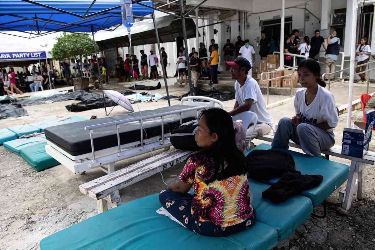 2025年10月1日,地震傷員在宿務省博戈市醫院的入口處接受治療。本次地震震央位於宿務省博戈市,當地醫院接收的傷者不斷增加,已使醫護力量面臨巨大壓力。(Ted Aljibe/AFP via Getty Images)