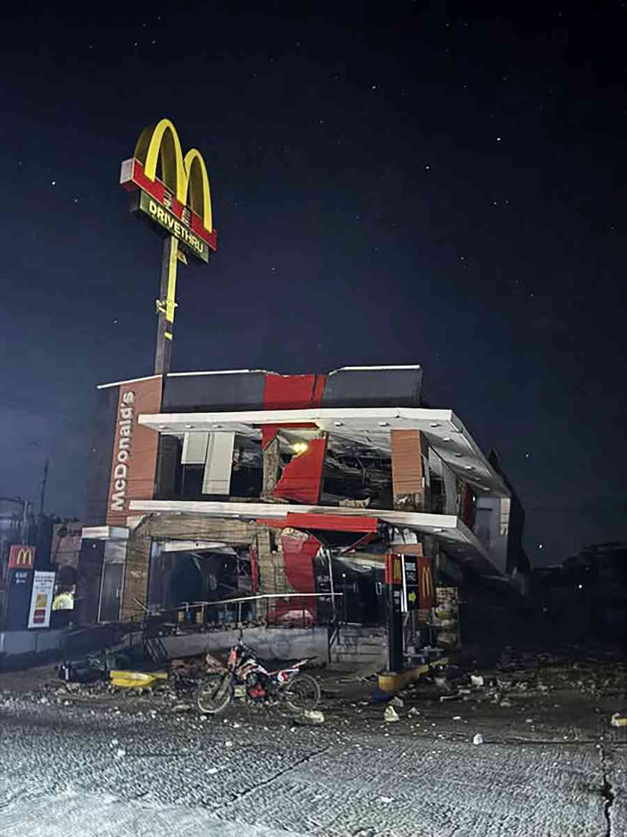 2025年9月30日,菲律賓中部發生6.9級強震,宿務省博戈市一家麥當勞分店遭到嚴重損毀。(Handout/Courtesy of Facebook user Art Pelayo, Facebook,UGC/AFP)