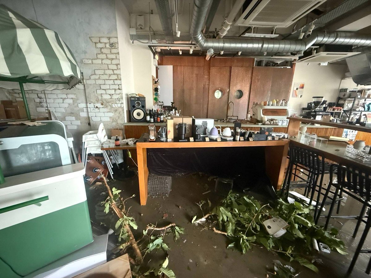 位於將軍澳海旁的咖啡店「Urban Coffee Roaster」負責人之一John形容,今次水浸嚴重主要因為海水倒灌非常嚴重,周邊餐廳的物件也被沖到他的餐廳,導致水浸情況加劇,大部份物品都被浸壞了。但由於有牆壁和趟門稍微阻擋了一下,損失相對沒那麼嚴重。相反,旁邊幾間全開放式設計的店情況更糟,幾乎全毀。