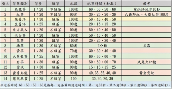 我運用多年的司茶經驗製作了泡茶秘笈(如圖表1),詳述每種茶水比例、是否醒茶、水溫、泡茶秒數等,泡茶秒數列示60,50,50,60是指每一泡茶葉的浸泡時間,例如第一泡60秒、第二泡50秒、第三泡50秒、第四泡60秒、爾後每加一泡加10秒鐘,以此類推。切記秒數於注水時就開始計算,有些人誤以為是水倒完了蓋上壺蓋才開始算,那就錯囉!