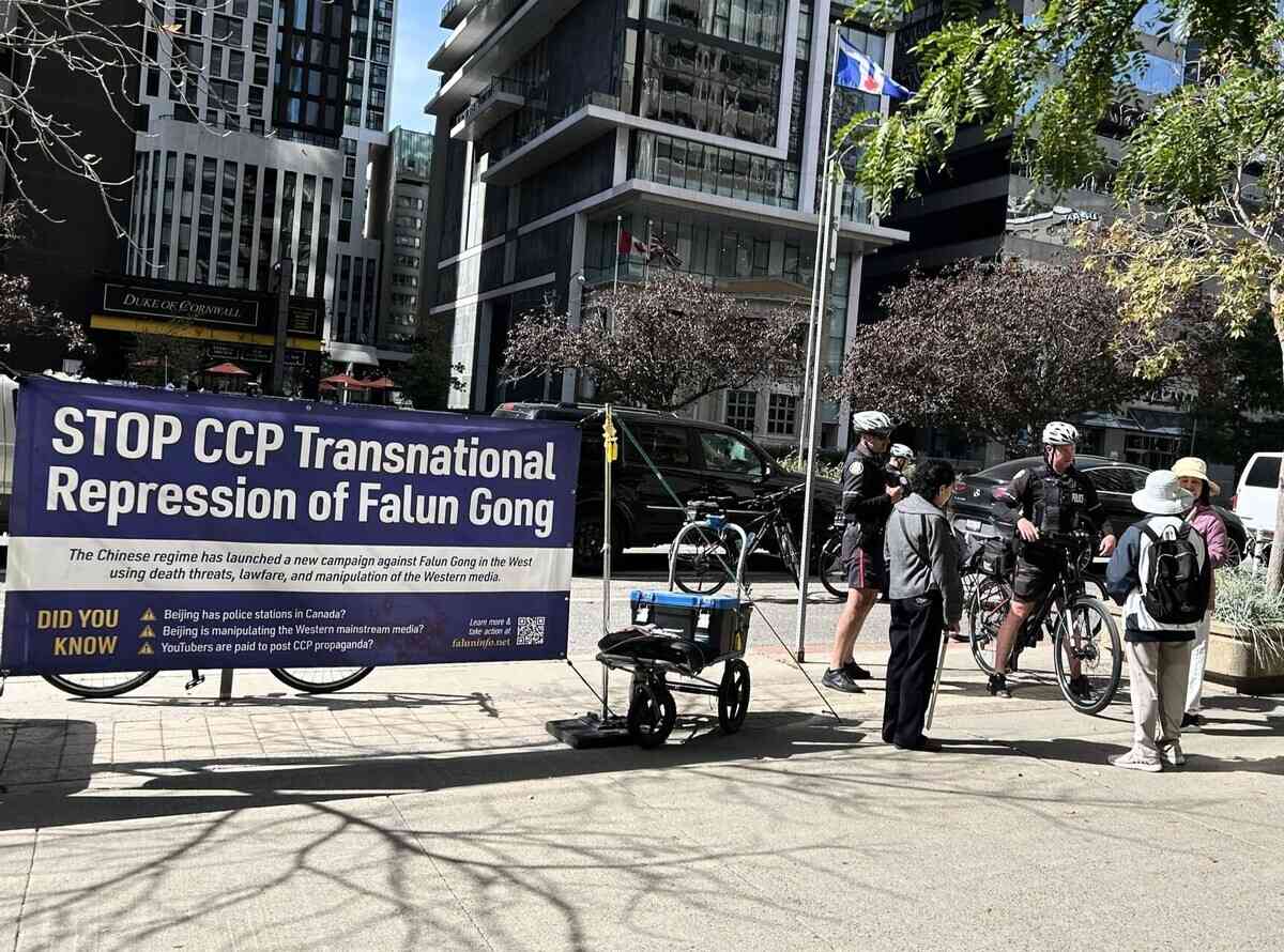下午1點20分,2位警察趕到,向法輪功學員了解情況。大樓保安和在旁邊吃東西的路人一直等到警察到來,並向警察講述他們看到的情況後才離開。