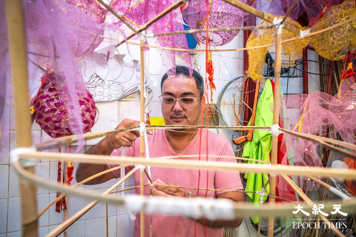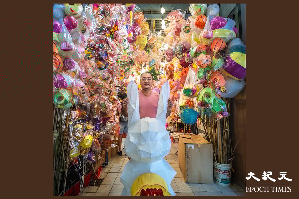 每逢中秋節前夕,他的舖頭旁總會展示一個不同造型的大白兔燈籠。今年的作品是運用現代紮作技巧製作的大白兔,既頑皮又可愛,憨態可掬,吸引不少途人駐足欣賞,感受節日氣氛與工藝魅力。