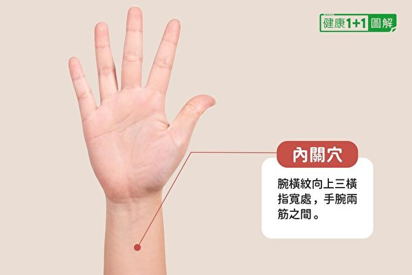 內關穴:內關穴位於手腕內側,腕橫紋向上三橫指寬處,手腕兩筋之間。內關穴與心臟相對應,有保護心臟與心血管的效果,同時可以平衡自律神經。按摩內關穴能有效緩解心悸、胸悶、心跳過速等症狀,有助於安神助眠。