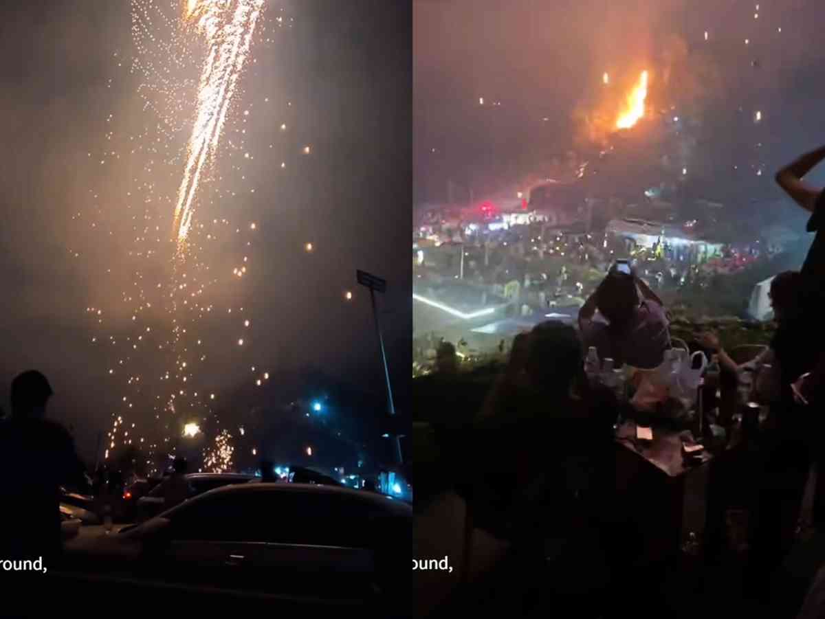 現場片段顯示,火花如流星雨一般從天空掉落到劇院上方和人群中,現場隨即有人呼喊,「好危險。」「這不對勁兒呀,砸到人了。」「著火了,救命。」隨後現場附近的樹木被點燃,人們開始撤離。(點擊影片)