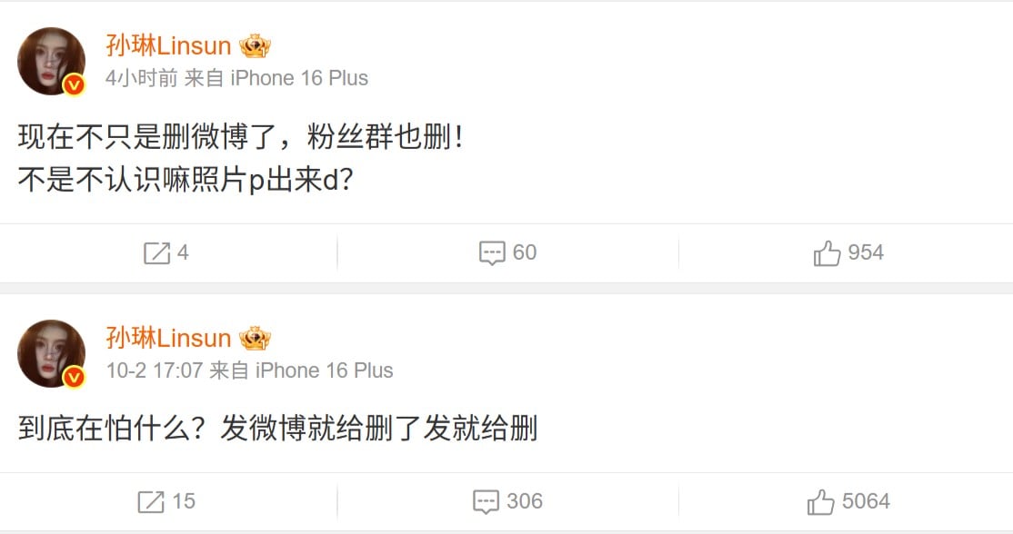 10月3日,她再發帖表示,「現在不只是刪微博了,粉絲群也刪!」她在留言區直言,「下次直接把我刪了算了,別刪微博了。」