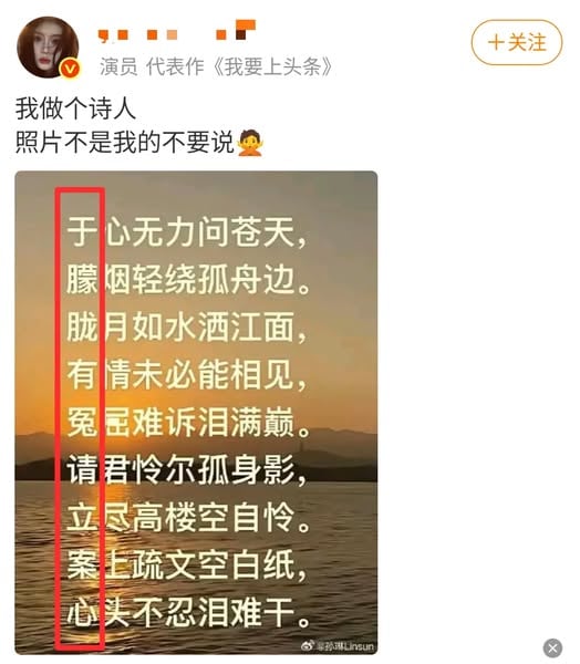 孫琳近日在微博分享了一張圖片,寫道:「我做個詩人,照片不是我的,不要說。」圖片中,還用紅框圈出每句話的第一個字,連起來就是「于朦朧有冤請立案」。