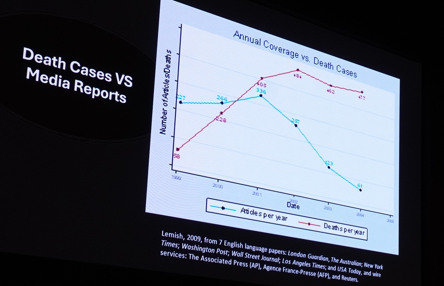 她說,一項針對多家國際大媒體的研究發現,「隨著法輪功學員遭迫害死亡人數的增長,國際媒體報道法輪功遭酷刑迫害的報道數量卻不斷減少, 最後基本上被消聲。」這項研究涉及的七份報紙分別是:《倫敦衛報》、《澳洲人報》、《紐約時報》、《華盛頓郵報》、《華爾街日報》、《洛杉磯時報》、《USA Today》,此外,還包括新聞通訊社、美聯社、法新社以及路透社。