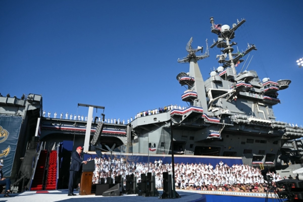 「我們齊聚這個富有歷史意義的濱水之地,共同慶祝美國海軍250年來所展現的力量、堅韌與堅定不移的勇氣 —— 這是一支有史以來馳騁於海上的最強大戰鬥力量。」總統說。