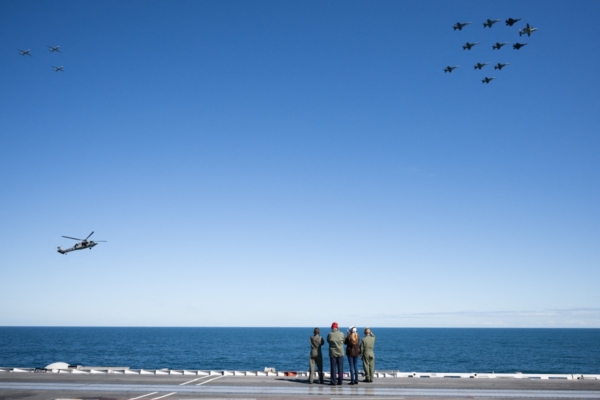特朗普總統夫婦站在航母甲板上觀看了一場軍事表演。海軍驅逐艦向大西洋發射了導彈和炮彈,海豹部隊隊員從直升機上空降,戰鬥機從航母上彈射起飛。