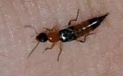 資料顯示,隱翅蟲體型細長形似螞蟻,體長通常在5~10毫米,紅黑相間。隱翅蟲的種類繁多,其中對人有威脅的有毒隱翅蟲亞科有20多種。
