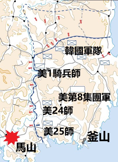 美軍第8集團軍的第24步兵師於7月初全部抵達南韓,第1騎兵師和第25步兵師分別於7月14日至18日抵達。在前期的阻擊戰中,美軍減員超過6,000人,但隨著不斷增援,8月初美軍在南韓境內的地面部隊達到了約4.7萬人。