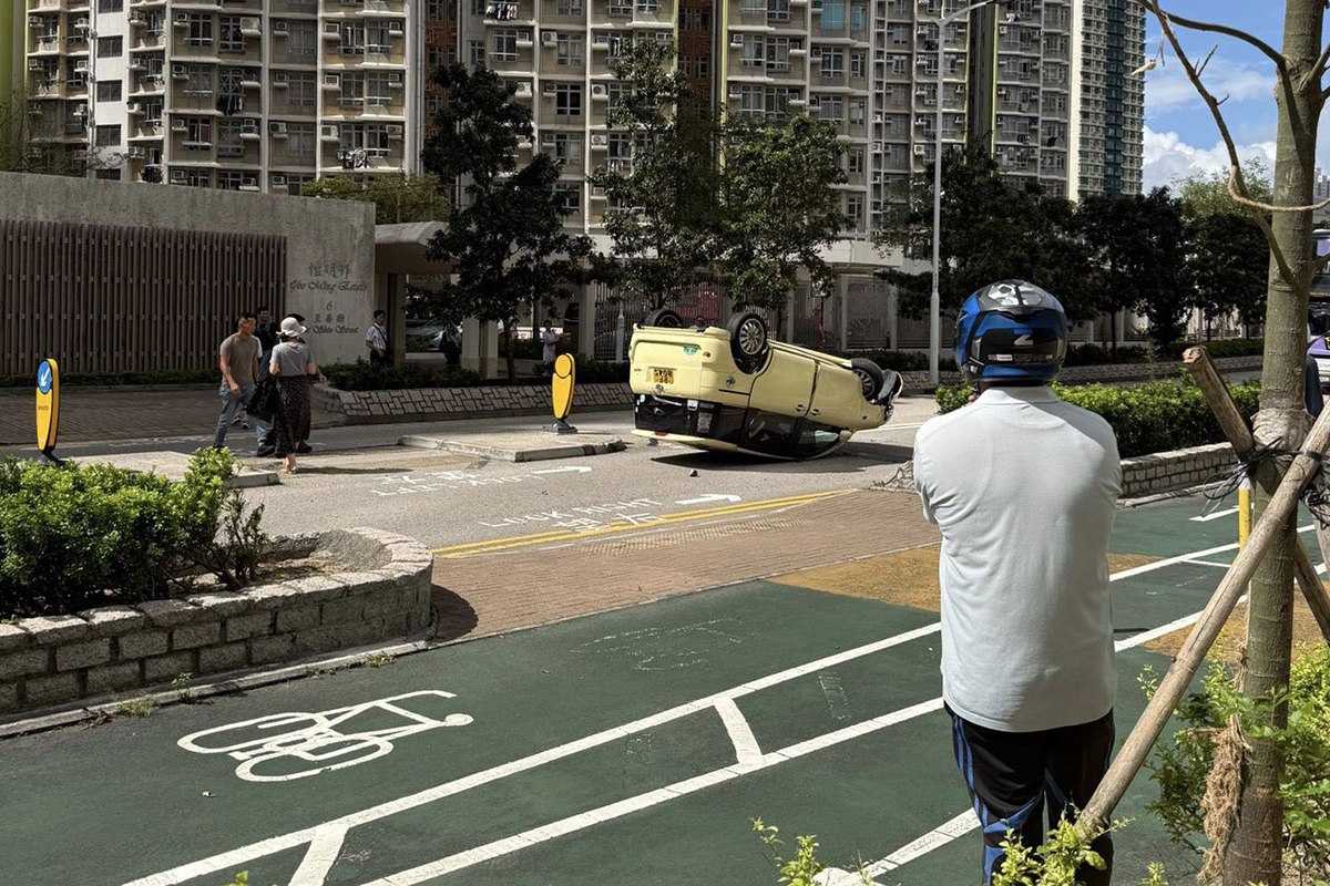 今日(6日)下午1時許,將軍澳至善街5號雍明苑對出一輛黃色私家車懷疑失控撞向路邊石壆後,自炒翻轉,四輪朝天,54歲譚姓男司機一度被困車內,其後由途人協助救出,亦有途人見狀報警求助,消防及救援人員到場施援,意外中無人受傷。警方正調查意外原因。@