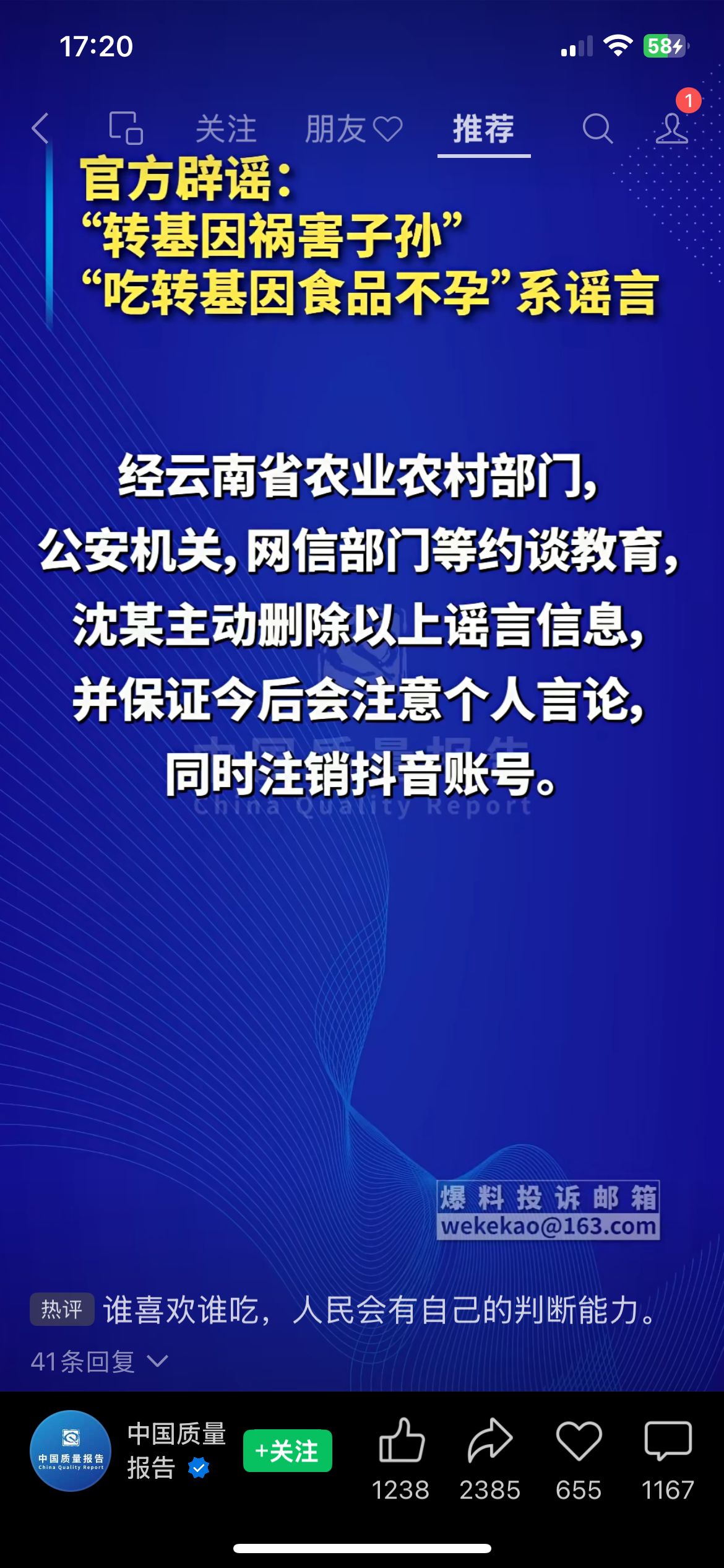 該條澄清基因改造食品「安全可靠」,並批判網民沈某的訊息,引發網民熱烈討論和質疑。浙江網民「張永昌」在評論區留言:「誰喜歡吃,老百姓自有判斷能力。」四個小時內獲得六千多個點讚。