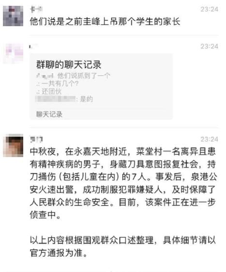 網上有官方通報口吻的帖文稱,當晚22時左右,「菜堂村一名離異且患有精神疾病的男子」持刀傷人,7人被捅傷。兇犯「已經被捕」云云。