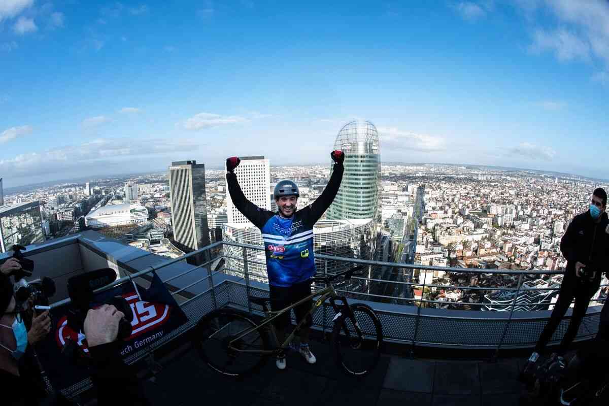 豐特努瓦在鐵塔的觀景台上,還高舉12分30秒的紀錄板和陪他一起完成挑戰的山地車,和大家一起分享他挑戰成功且打破紀錄的喜悅。
