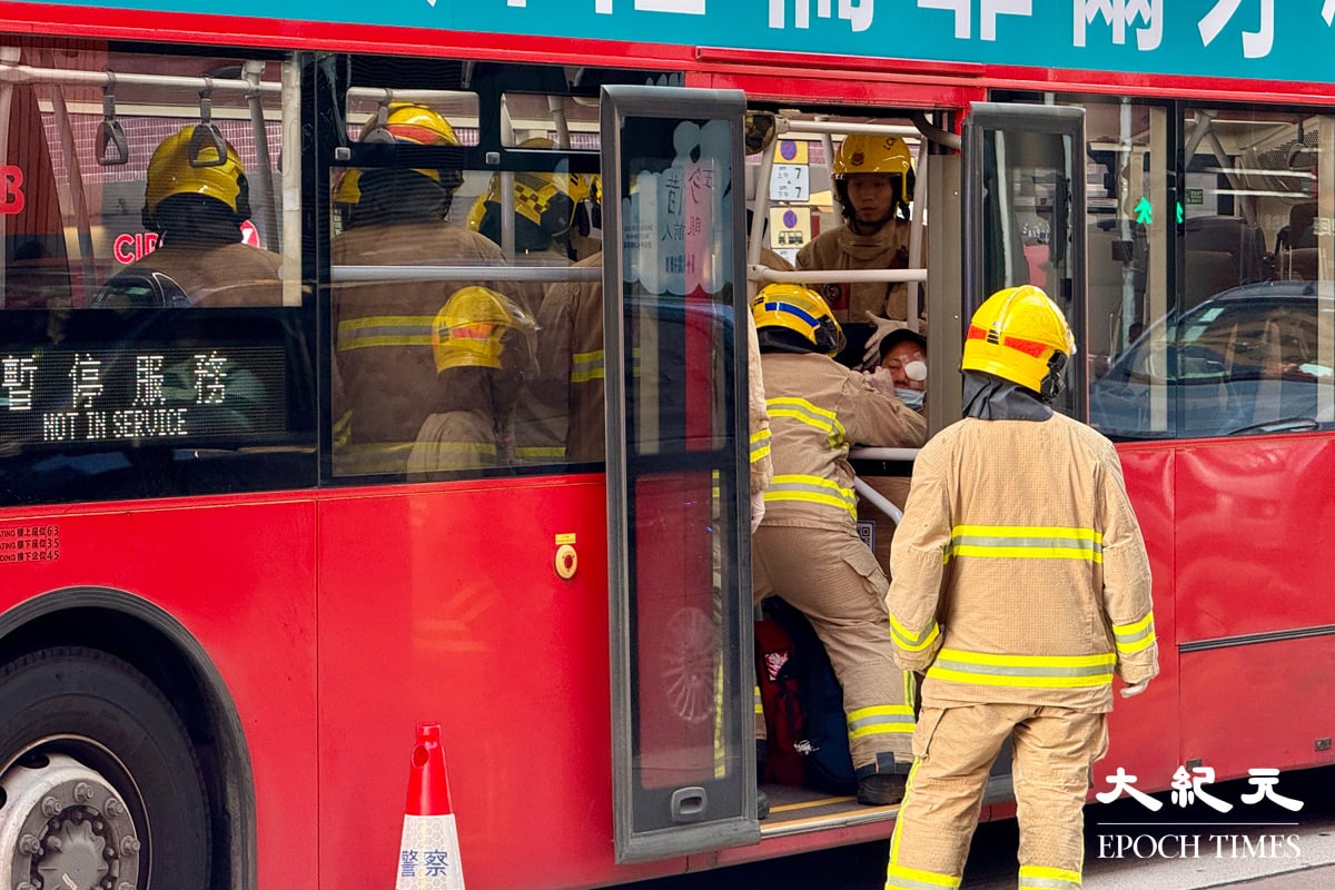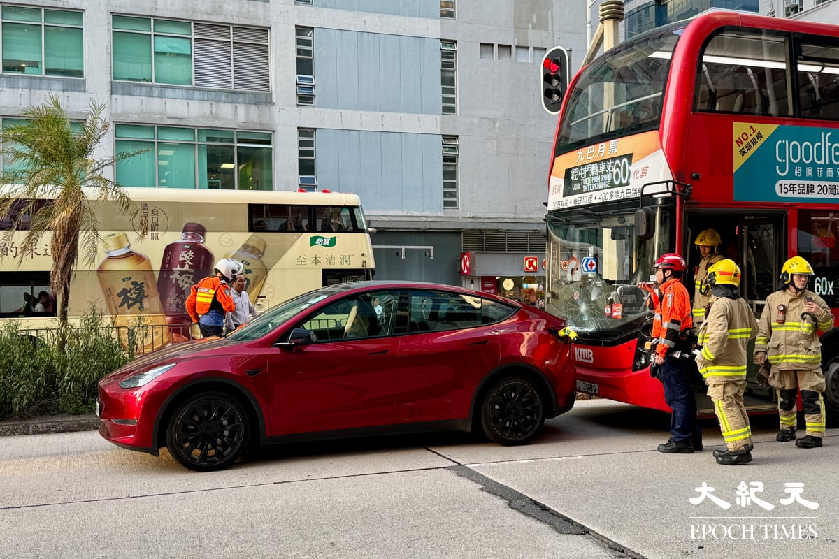 現場照片顯示,涉事60X線九巴車頭玻璃破裂,多輛消防車及救護車到場。@