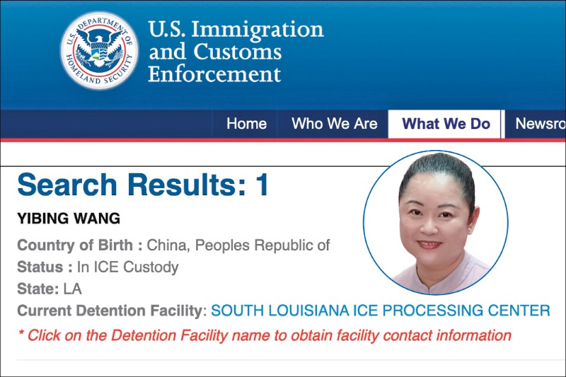 根據ICE網站查詢結果顯示,王一冰(YiBing Wang)目前仍被拘押於南路易斯安那州的ICE處理中心。她的代理律師古奇(Edward J. Cuccia)向《大紀元》回覆稱:「我確實代表王女士,但目前情況非常混亂,我(希望)在接下來的幾天內能得到更多資訊。」