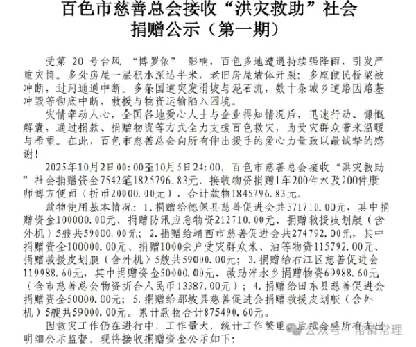 9月底至10月上旬,颱風「博羅依」與「麥德姆」(Matmo)先後襲擊廣西,多地遭洪水淹沒,災情嚴重。10月6日,百色市慈善總會發布《社會救助捐贈公示(第一期)》公布募捐情況。此次公開的七千五百多筆捐贈,主要針對颱風「博羅依」造成的百色地區災情。該颱風期間廣西多地出現持續強降雨,導致房屋浸水、橋樑衝斷及道路滑坡等災害。