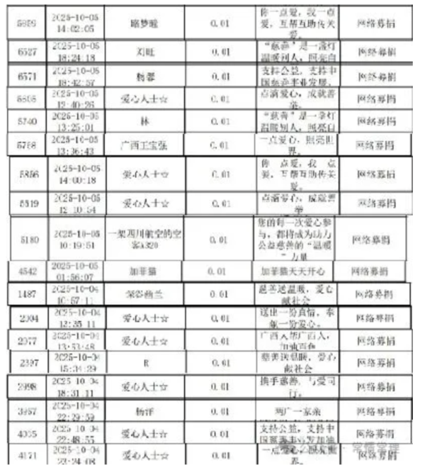 廣西在颱風「博羅依」(Bualoi)過境後,百色慈善總會公布的捐款明細中出現數十筆僅有0.01元(一分錢),也有0.02元、0.1元等「極小額」捐贈,引發民間熱議。有評論指出,一分錢雖少,卻像徵性地傳達了一種抗議,是對不透明慈善管理機制的不滿。
