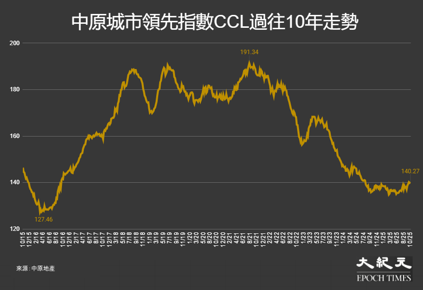 追蹤香港二手樓價的中原城市領先指數CCL於10日公布最新的數值為140.27點,截至10月5日,按周指數上升0.24%,按月則升1.10%,自疫情爆發以來(2020年1月26日起)跌21.01%,而3年的累積跌幅為17.79%。大型、中小型單位按周分別錄得下降0.91%、上升0.46%,3年累積跌22.22%、跌16.84%。