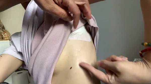 通過影片,張琦打開衣服讓記者看,她胸前有從氣管到腹部的手術長疤,還有一條從左胸到後背的刀痕,是她在不知情的情況下,被醫生活摘了左肺;另外,她腋下赫然有一個大洞,每天必須換藥清理。
