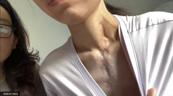 作為活摘器官的受害者,張琦說,她的氣管因為沒有縫合好,導致胸腔內部感染,裏面積存有膿水。