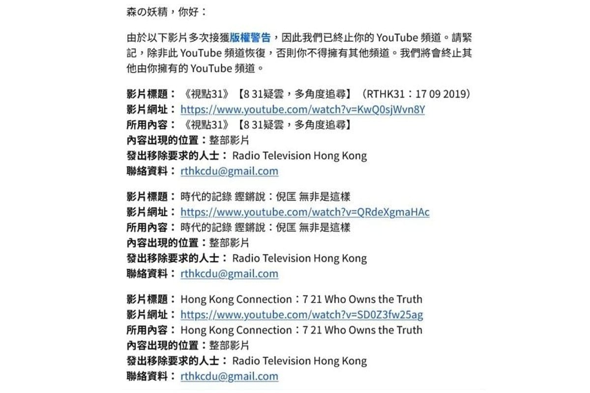 帖文附上YouTube發出的訊息截圖,指其上載的多部影片,多次接到版權警告,已經終止其YouTube頻道。見到涉事至少3部影片,均被香港電台提出要求移除,包括2019年9月播出、關於「831」事件的一集《視點31》、邀請反共作家倪匡作嘉賓的《時代的記錄——鏗鏘說》、《鏗鏘集》「7.21誰主真相」的英文版。
