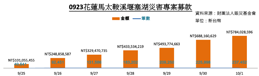 截至10月1日,募款金額已達7.8億元新台幣(見圖1),捐款筆數超過23.7萬筆,反映全台民眾熱心響應、踴躍支持災後重建。