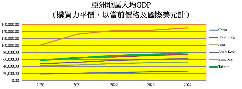 根據國際貨幣基金組織(IMF)資料(見圖2)顯示,2025年亞洲地區人均GDP(購買力平價,以當前價格及國際美元計)排名中,新加坡以15.6萬美元居首,其次為台灣8.4萬美元。其後依次為香港7.7萬美元、南韓6.5萬美元及日本5.4萬美元。
