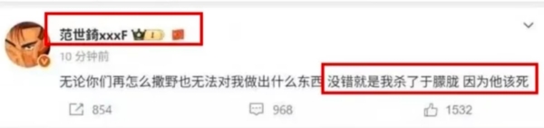 近日,有網民發現,疑似范世錡在微博帳號發文:「無論你們再怎麼撒野也無法對我做出甚麼東西,沒錯就是我殺了于朦朧,因為他該死。」