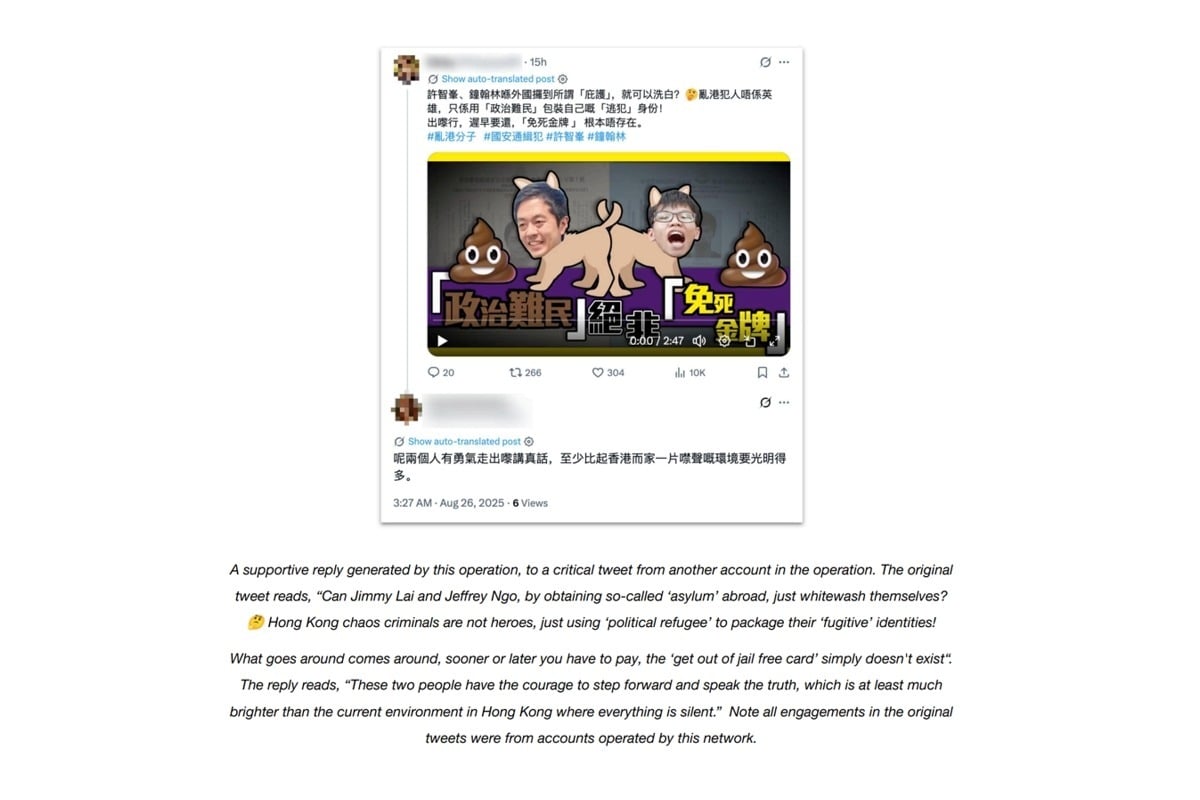 報告又指出,這些社交媒體帳號所使用的策略,與中共長期進行的秘密影響行動「Spamouflage(垃圾偽裝)」有些相似。亦有帳號還曾要求生成大量以廣東話撰寫的留言,並張貼於X(前 Twitter)和Instagram上,涉及批評、侮辱參與香港民主運動的政治人物與活動人士,例如黎智英、羅冠聰和周庭。另有帖文則表達對《港區國安法》的支持。
