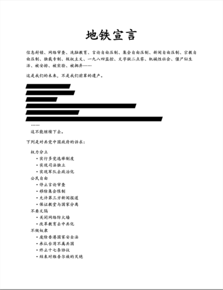 2022年的白紙革命給陳邦超帶來啟發,他認為運動缺乏明確方向:「我感覺那張白紙應該是填寫甚麼上去比較好一點,那我開始就在疫情剛開放的時候, 2022年12月左右,開始製作地鐵宣言。」這份宣言由他一人創作,涵蓋教育改革、拆除防火牆、司法獨立、新疆人權等訴求。