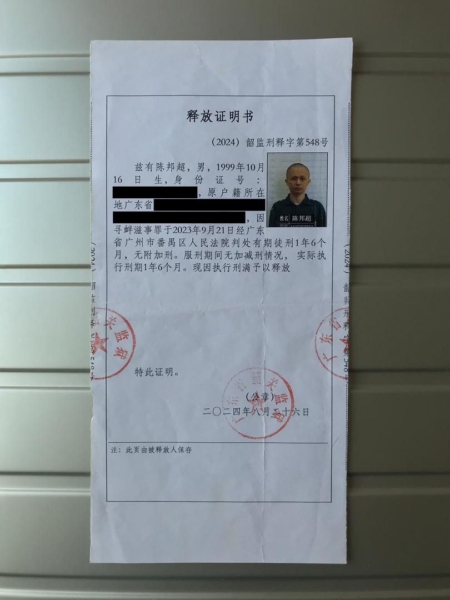 2024年8月陳邦超被刑滿釋放,在2024年10月至2025年9月間,他至少六次被國保或公安傳喚,被警告只能「接觸國家批准的媒體,不得翻牆或繞過審查。」 2024年9月27日,他嘗試續簽港澳通行證時,被告知已經被限制出境。2025年9月,他再次申請,被電話通知不允許簽注。