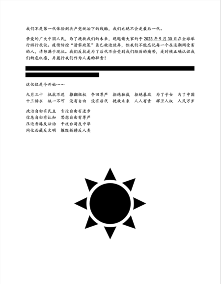 宣言中寫道:「抵抗不遲、推翻極權、奪回尊嚴、拒絕獨霸、拒絕暴政、為了子女、為了中國十三訴求、缺一不可、沒有自由、沒有後代、挽救未來、人人有責、捍衛人權、人民萬歲」。