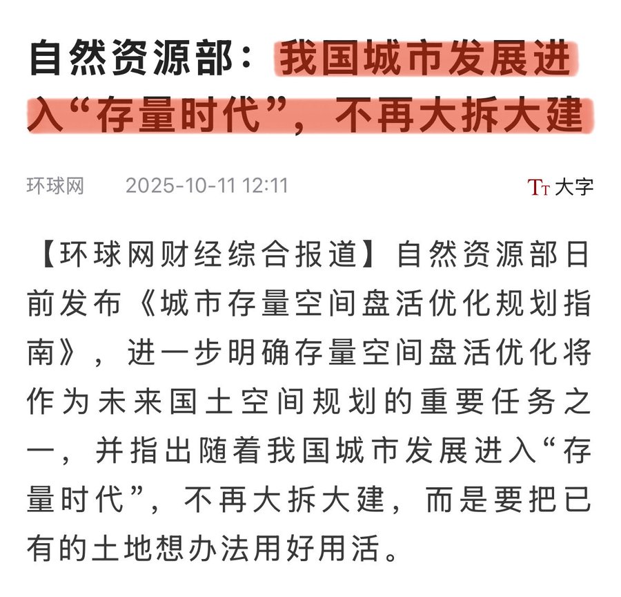 10月11日,新華社、環球網等中共官媒報道,近期自然資源部印發《城市存量空間盤活優化規劃指南》,要求各地「嚴控增量、盤活存量、優化結構、提高效率」,以整治低效用地、再開發舊城鎮與工業區、活化歷史街區等方式推動城市空間再生。