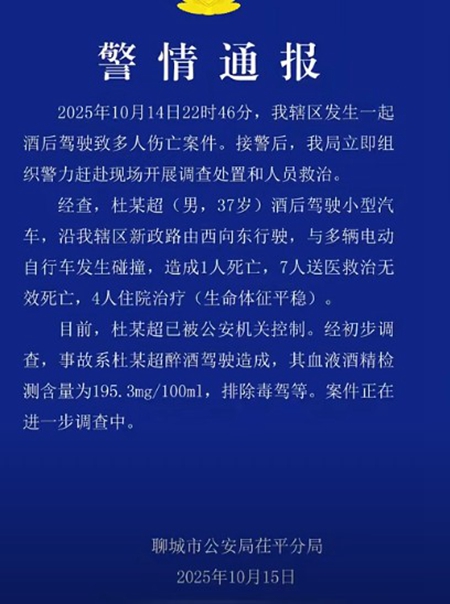 10月15日上午,聊城當地警方發布通報稱,10月14日晚10時46分,該轄區發生一宗酒後駕駛致多人傷亡案件。