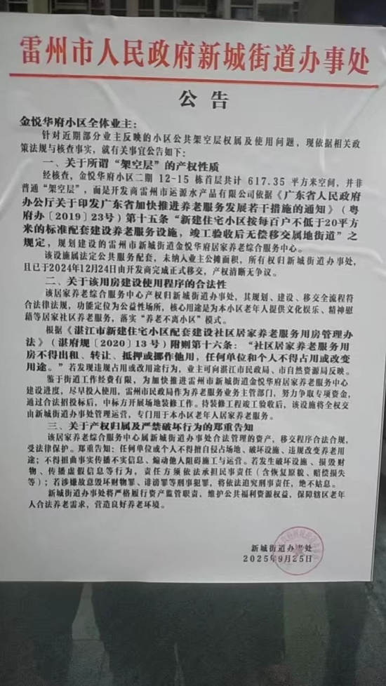 爭議焦點在於金悅華府小區二期12-15棟首層共617.35平方米空間的所有權。雷州市新城街道辦9月25日發布公告稱,該空間並非普通「架空層」,而是開發商依據廣東省政策建設的居家養老綜合服務中心,所有權歸街道辦,已於2024年8月24日完成移交。