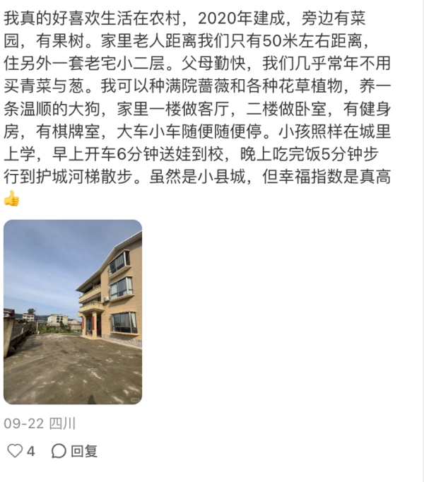 一名四川網民表示,「我前年賣掉城裏房子,回家修了300平,住著真舒服,除了當牛馬通勤時間並沒有任何改變,沒有物業,停車自己家,去個購物城15分鐘,我就願意當這個回村建房的大冤種。」