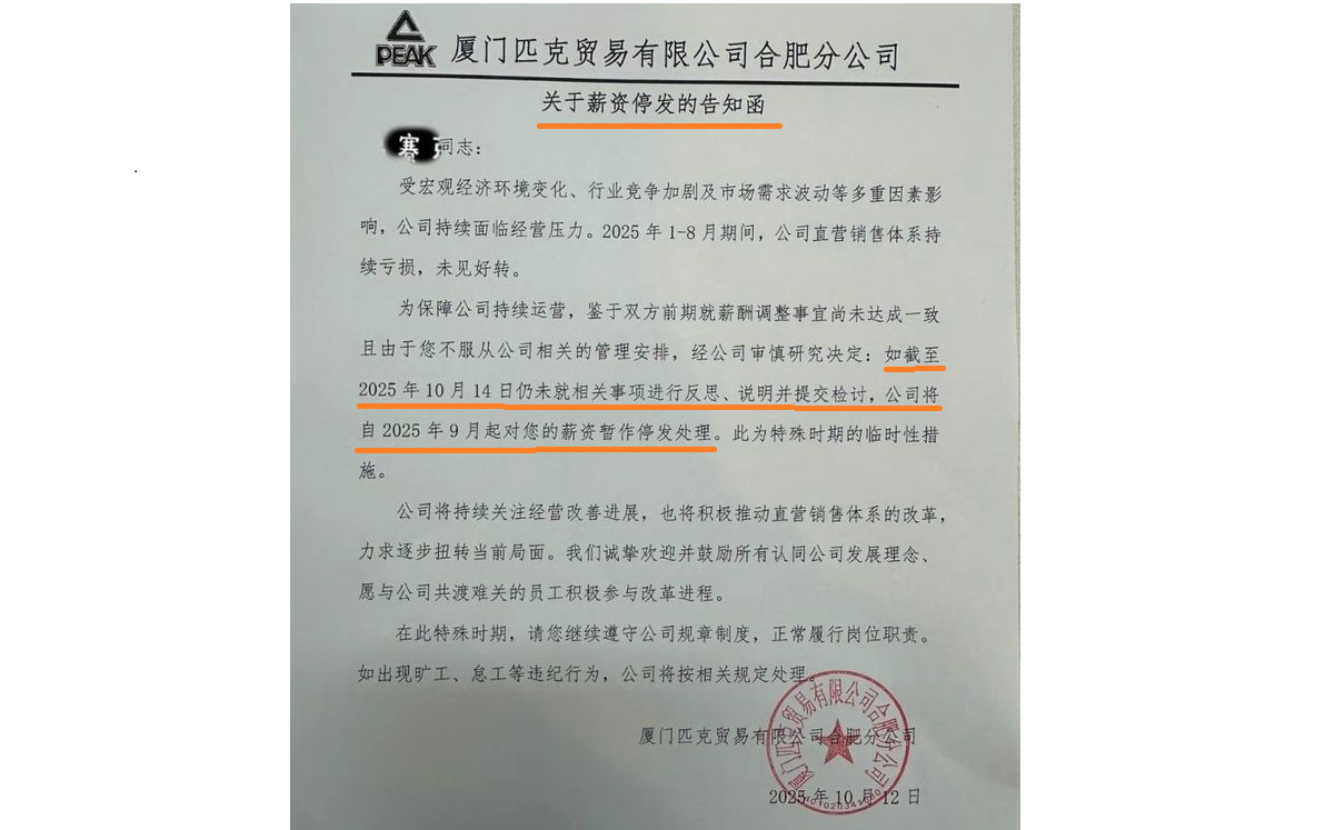 據大陸「上游新聞」報道,匹克員工近日提供了一份匹克公司下發給員工的《關於薪資停發的告知函》。這份加蓋紅章的正式文件說,「如您至2025年10月14日仍未就相關事項進行反思、說明並提交檢討,公司將自2025年9月起對您的薪資暫作停發處理。」